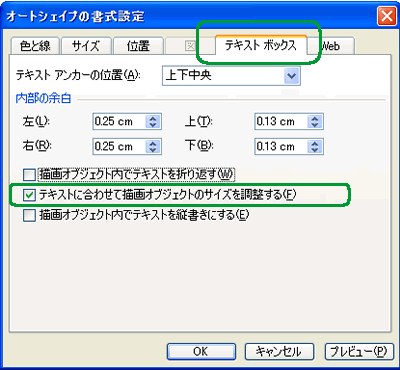 [オートシェイプの書式設定] ダイアログボックスが表示されるので、[テキストボックス]タブをクリックし、 □テキストに合わせて描画オブジェクトのサイズを調節する にチェックをつけます。