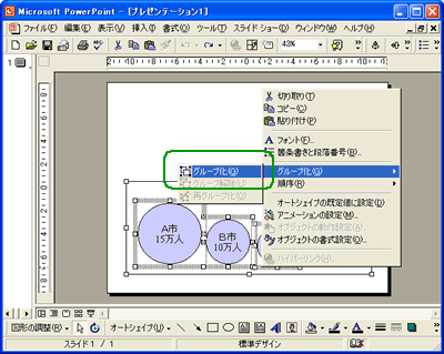 そこで、これらの図は、グループ化を行ってひとつの図として扱います。グループ化を行うには、ひとつの図として扱いたいオートシェイプをすべて選択し、選択したオートシェイプの上で「右クリック」→「グループ化」→「グループ化」を選びます。